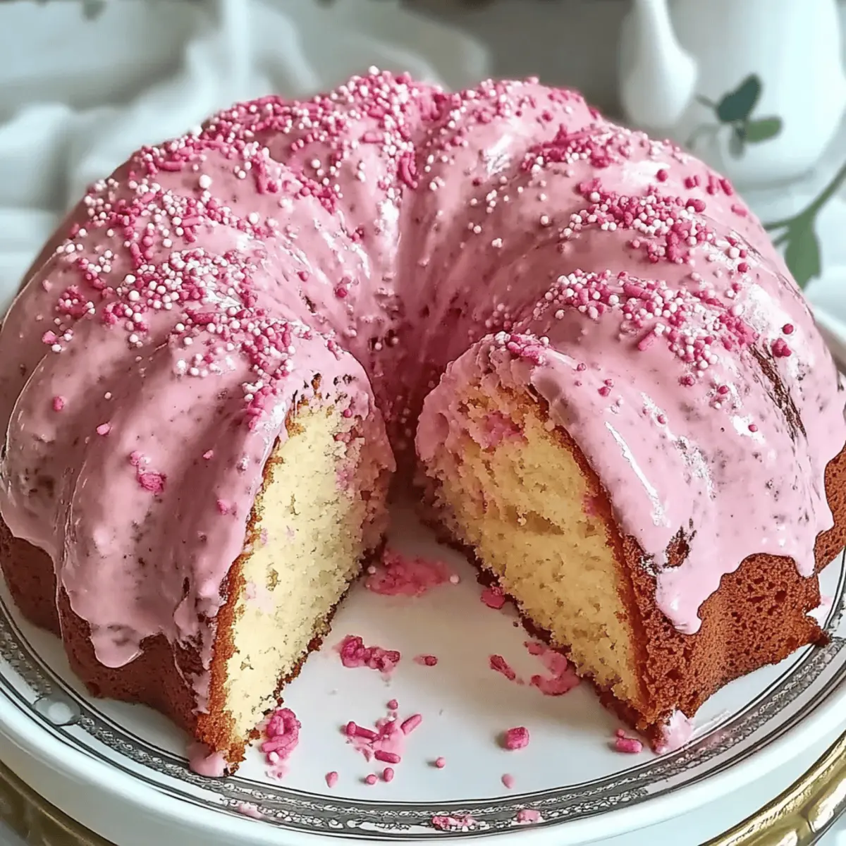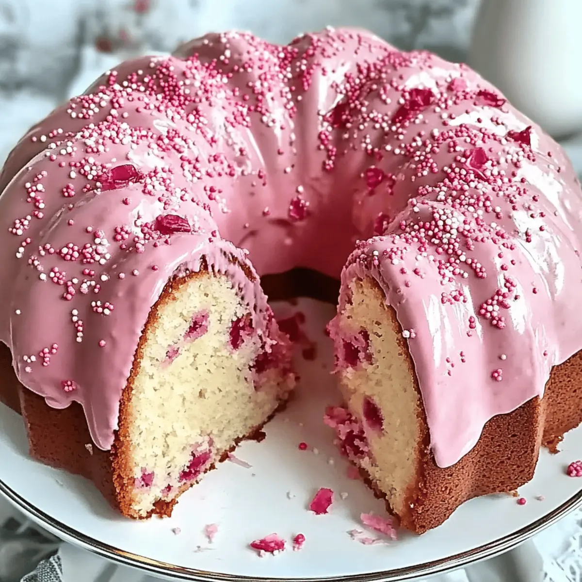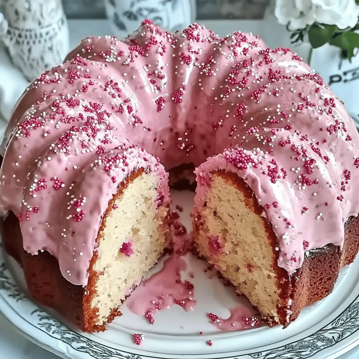 Once the cake is completely cool, place it on a serving plate. Pour the glaze generously over the top, allowing it to drip lovely down the sides. To finish, sprinkle with the remaining homemade pink sprinkles, creating a vibrant, festive look for your Cherry Blossom Bundt Cake that will impress anyone!