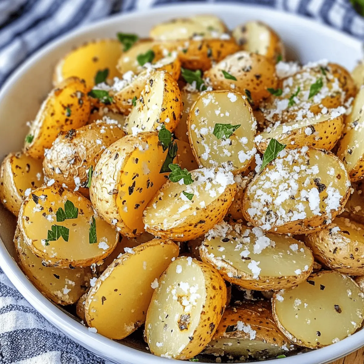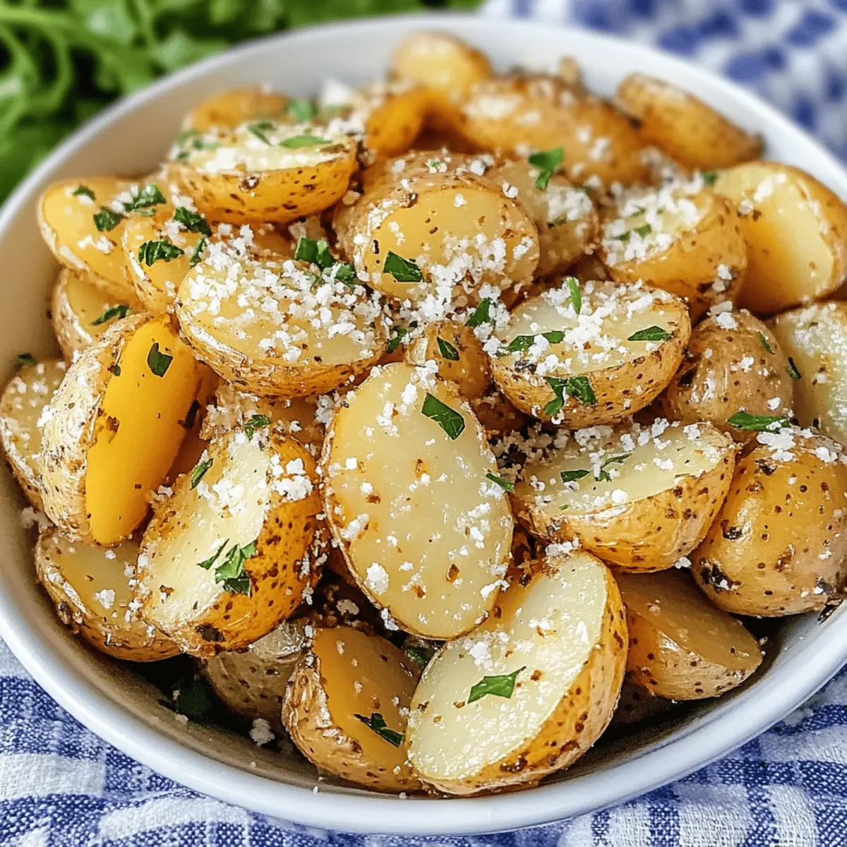 - In a large mixing bowl, combine the halved potatoes with olive oil, dry ranch seasoning mix, minced garlic, and dried parsley.