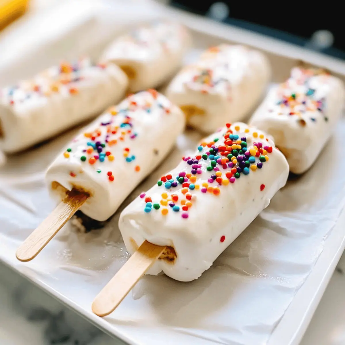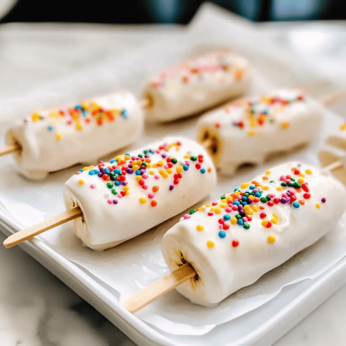 Once fully coated, return the banana pops to the parchment-lined baking sheet. While the yogurt is still wet, sprinkle rainbow sprinkles evenly over the surface of each pop for a vibrant touch. You can also use finely chopped nuts or shredded coconut for added variety and texture if you prefer.