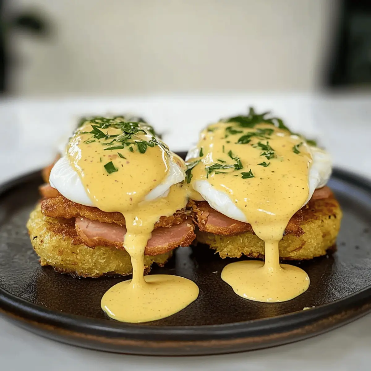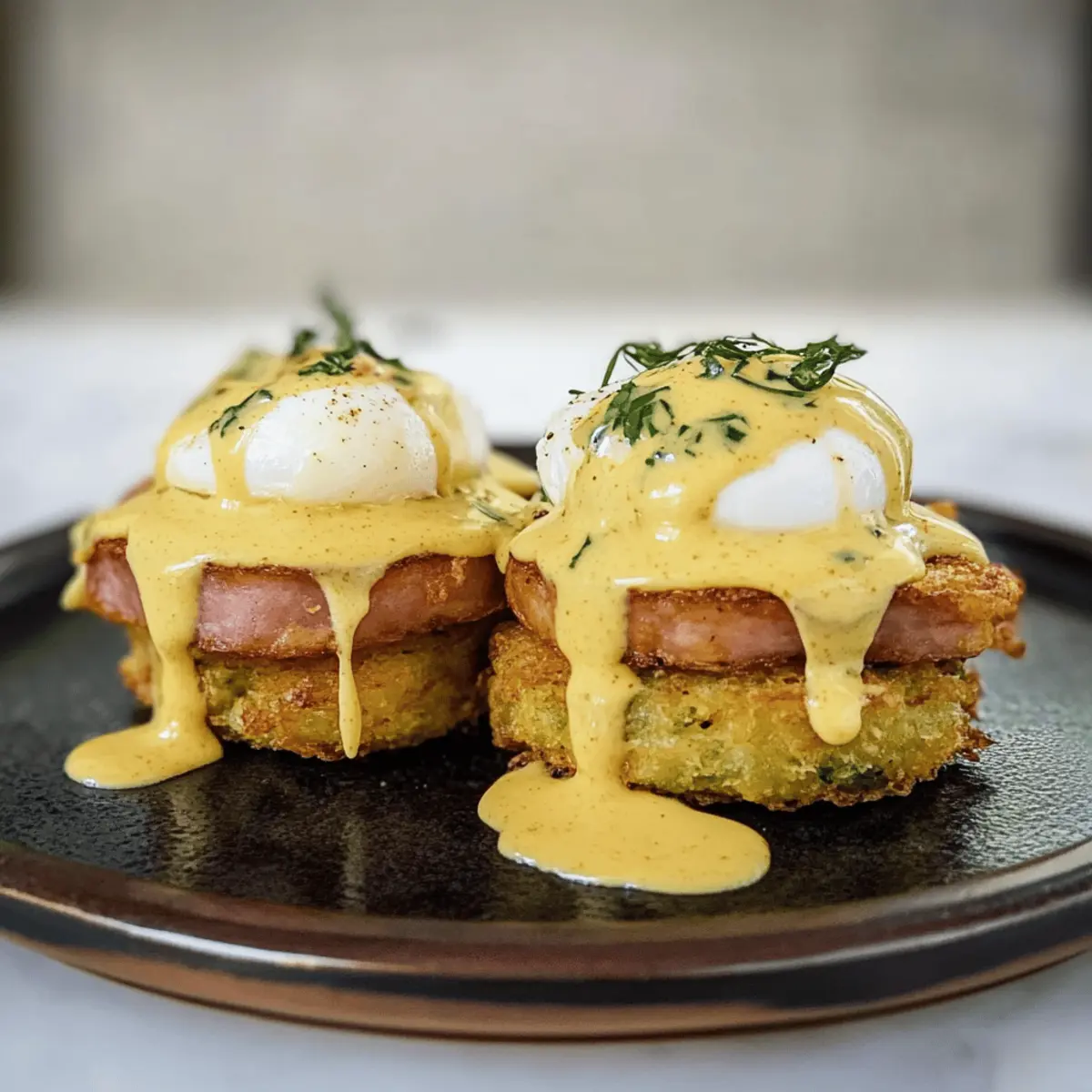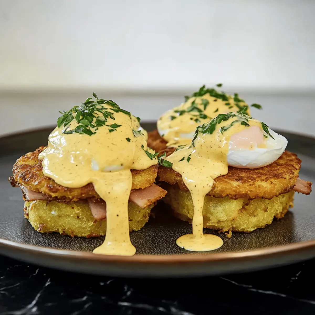 - Assemble the Dish: Plate hash brown patties, layer with ham and poached eggs, and drizzle with hollandaise.
