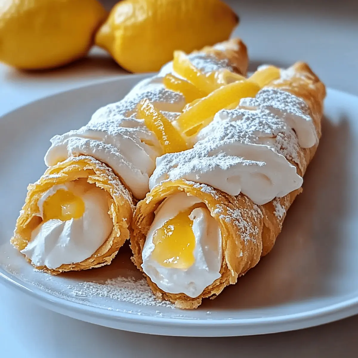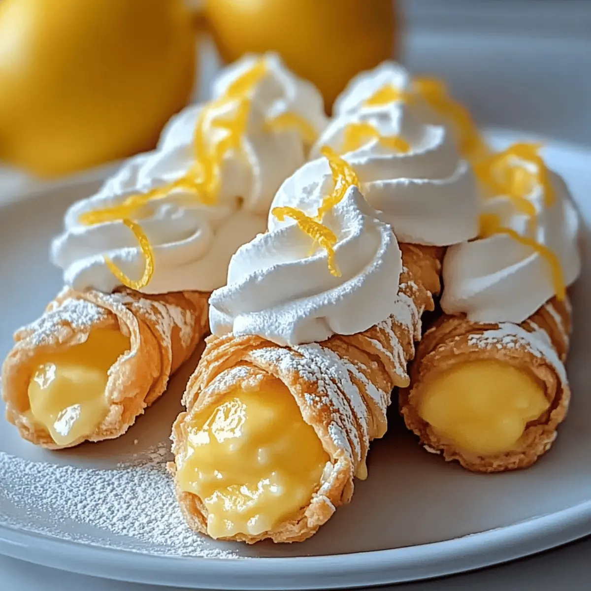 Next, swirl the whipped cream generously over the lemon curd in each shell, allowing it to peek over the edges like fluffy clouds. This not only adds a lovely texture to your Lemon Meringue Pie Cannoli but also balances the tartness of the filling. Take time to achieve a nice, artful presentation.